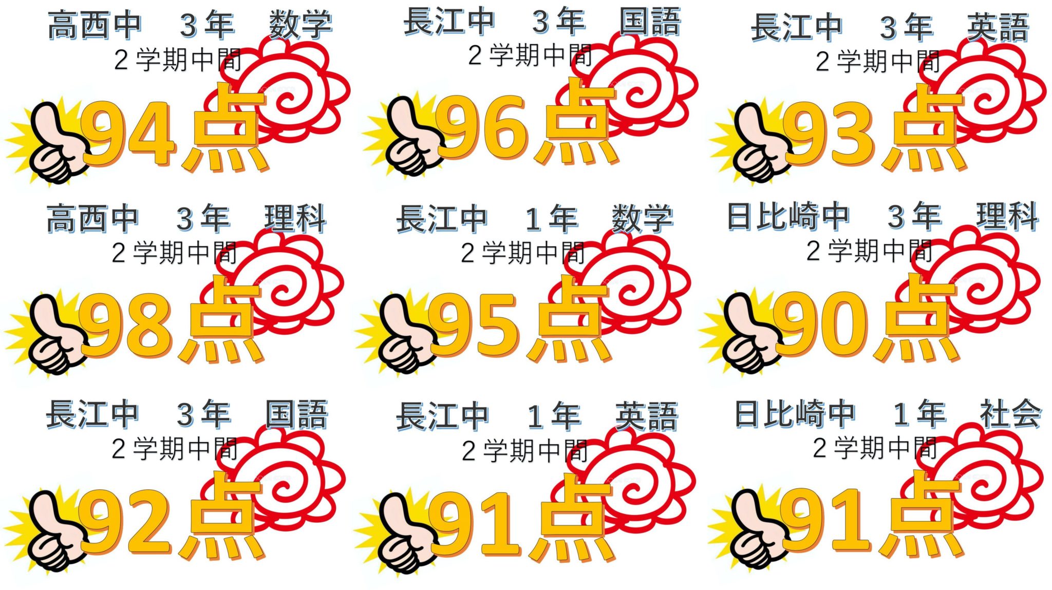 塾内9教科TOP10の内訳は、新中3が5人、新中2が5人で同数です。5教科の学年の平均点も4点しか違いません。ここからお互いにさらに高めていきましょうね!