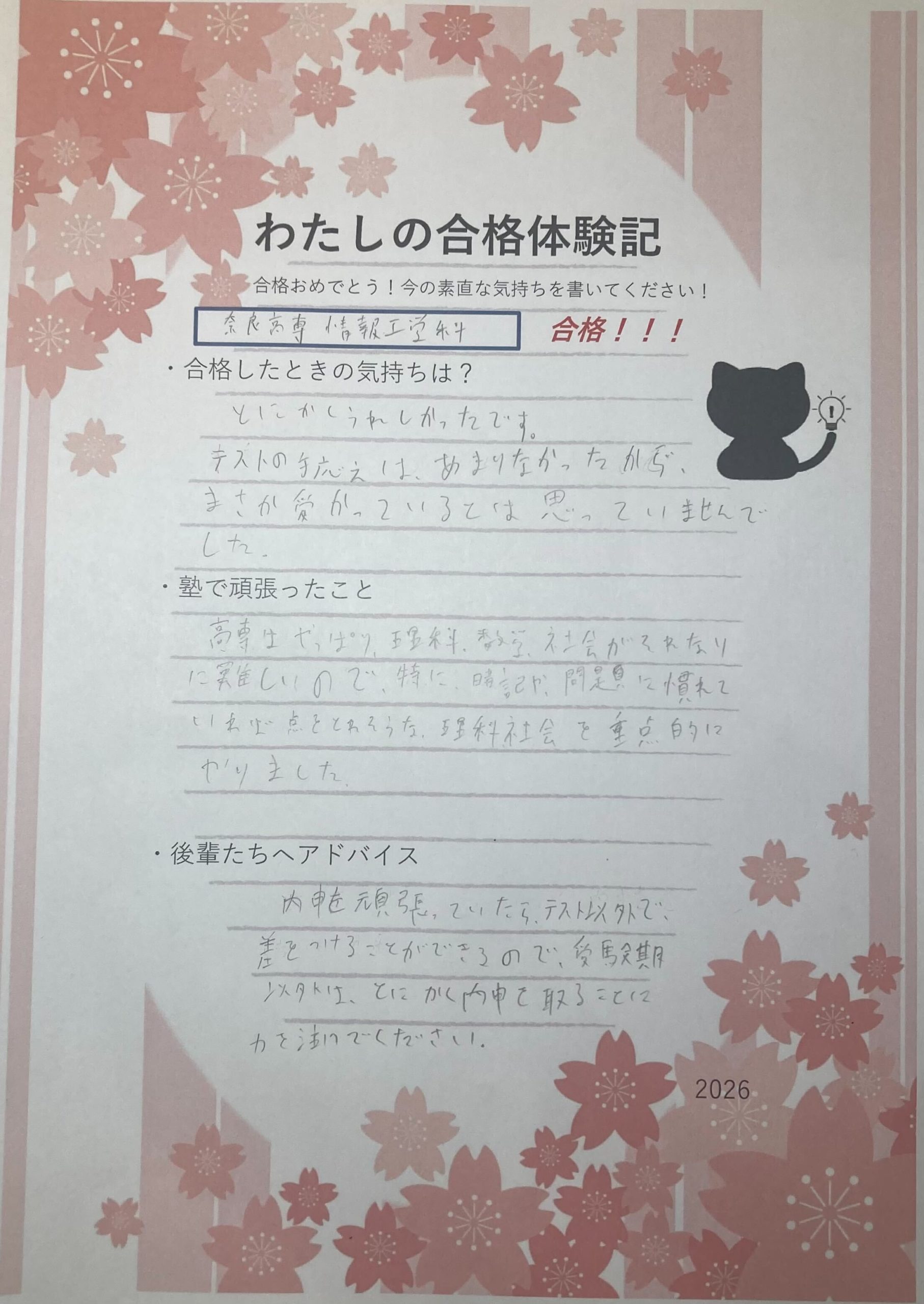 どちらも倍率はおよそ2倍、偏差値の高い高専なので、全国の優秀な生徒さんたちとの勝負でしたが、見事に合格を勝ち取ってくれました! そんな2人から合格体験記を預かっていますので、ぜひ共有させてください!